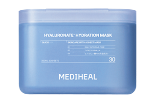 低分子ヒアルロン酸が肌の角質層まで浸透。肌あたりの優しいシートが顔の細部までぴったり密着。ヒアルロネート ハイドレーションマスク 30枚入り ¥2,640/メディヒール(韓国高麗人蔘社)