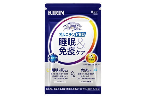 睡眠の質を改善するオルニチンと、免疫をサポートするプラズマ乳酸菌を含有。キリン オルニチンPRO 睡眠&免疫ケア(機能性表示食品) 90粒入り ¥2,860(編集部調べ)/キリンホールディングス