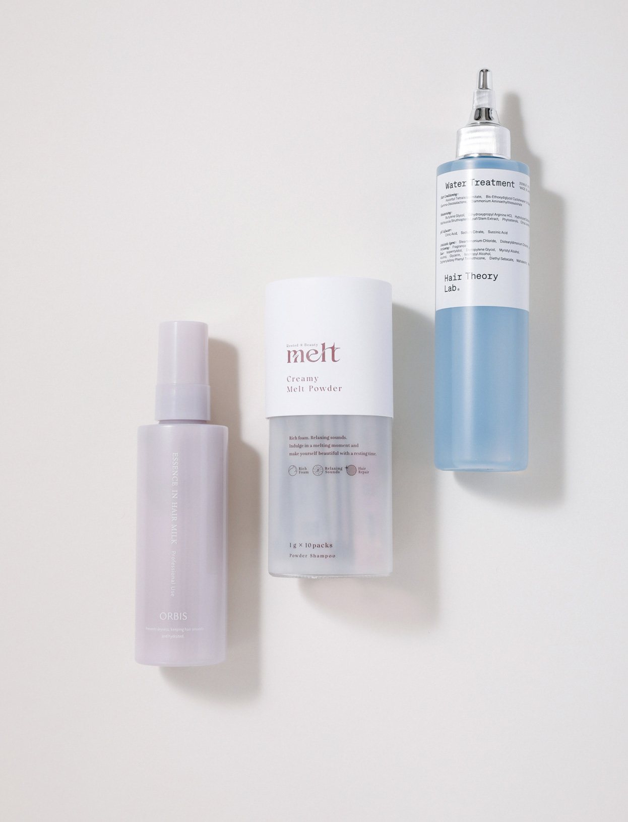 左・「しっとり感が強めで、髪にまとまりを出せるのでダメージが気になるときほど力を発揮してくれます」オルビス エッセンスインヘアミルク プロフェッショナルユース 140㎖¥2,860╱オルビス