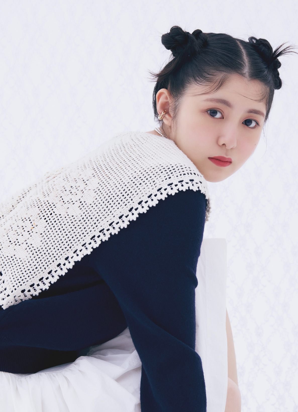 トップス¥95,700/シー ニューヨーク(S&T) スカート¥41,800/ロックフィッシュウェザーウェア × ミンジュキム(トヨダトレーディング プレスルーム) イヤカフ¥2,090(3点セット)/ゴールディ ネックレス¥49,500/アウェアジェイダブリュー(ハチマルゴショールーム)