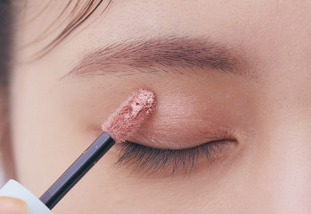 1.ダスティローズのaをアイホール全体へ薄く広げ、まぶたにとろけるような光と淡い陰影をオン。穏やかな輝きと可憐でチャーミングな血色を纏う。