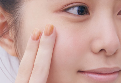 3.頬骨の高い位置にcのハイライトを指でポンポンなじませる。光のヴェールが赤の柔らかさを引き立て、みずみずしいツヤと立体感を与える。