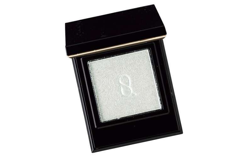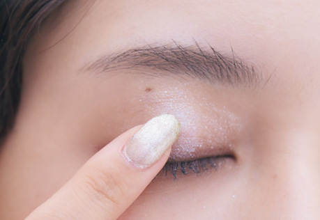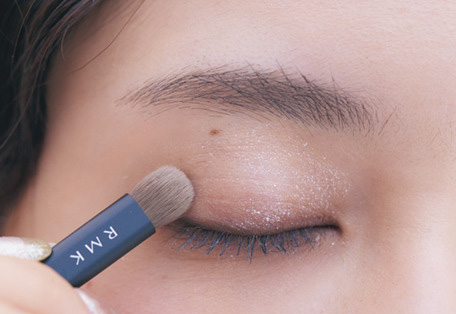 2.bの左上アクアティックシルバーをアイホール全体に薄くなじませる。微細パールが光を柔らかく反射し、まぶたにひんやりとした透明感を与える。