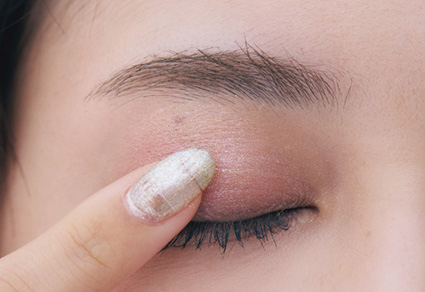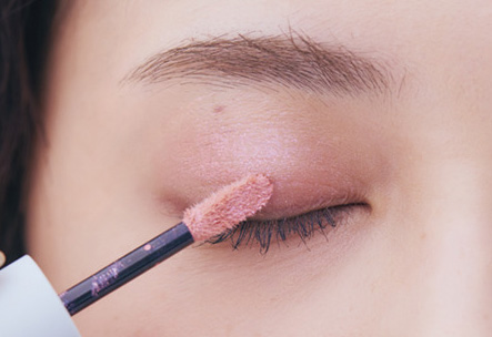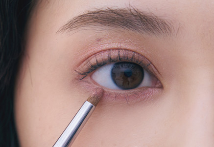 3.下まぶたのキワにシックなピンクのhをふんわり塗布する。下まぶたに繊細な光と淡い血色を集めることで、眼差しに透明感と儚さをプラス。