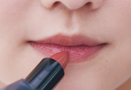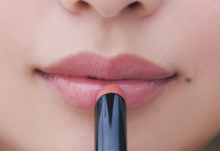5.ブラウニーピンクのeを唇全体に薄く塗布する。ほんのり透けるツヤが表情にニュアンスを添え、ほのかなセンシュアリティをじんわりと漂わせる。