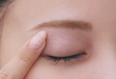 1.ホワイトにピンクの光が溶け込んだaをアイホール全体にふんわり。透明感のある微細パールで、まぶたに柔らかな光のヴェールを纏わせる。