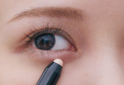 2.目頭から黒目下まで、下まぶたにアイボリーのbでハイライトをのせる。繊細なパールで、眼差しに澄んだ透明感と自然な立体感をもたらす。