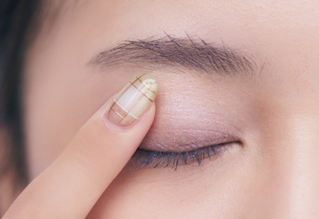 1.aでなめらかなツヤ肌に整えたら、アイホール全体にbを薄く広げる。繊細な光を含むラベンダーが肌に溶け、まぶたに神秘的な輝きと奥行きを与える。
