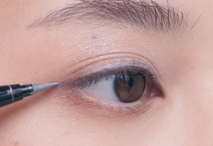 2.ブルーとグリーンが混ざるシルバーのcを、上まぶたのキワに引く。まつげの間を埋めるように入れ、目元を引き締めながら印象的な眼差しに。