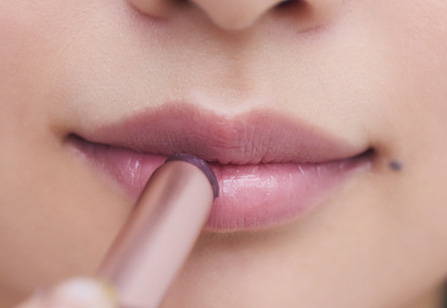 4.シアーなボールドブラウンのeを唇全体にラフにオン。血色を抑えたトーンが、まぶたのブルーと調和。上品で洗練された透明感を纏わせて。
