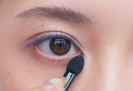 3.目頭のくぼみに沿ってくの字にdの左上のブルーハイライトをなじませる。繊細な光を含む淡いブルーが煌めき、眼差しに澄んだ透明感をプラス。