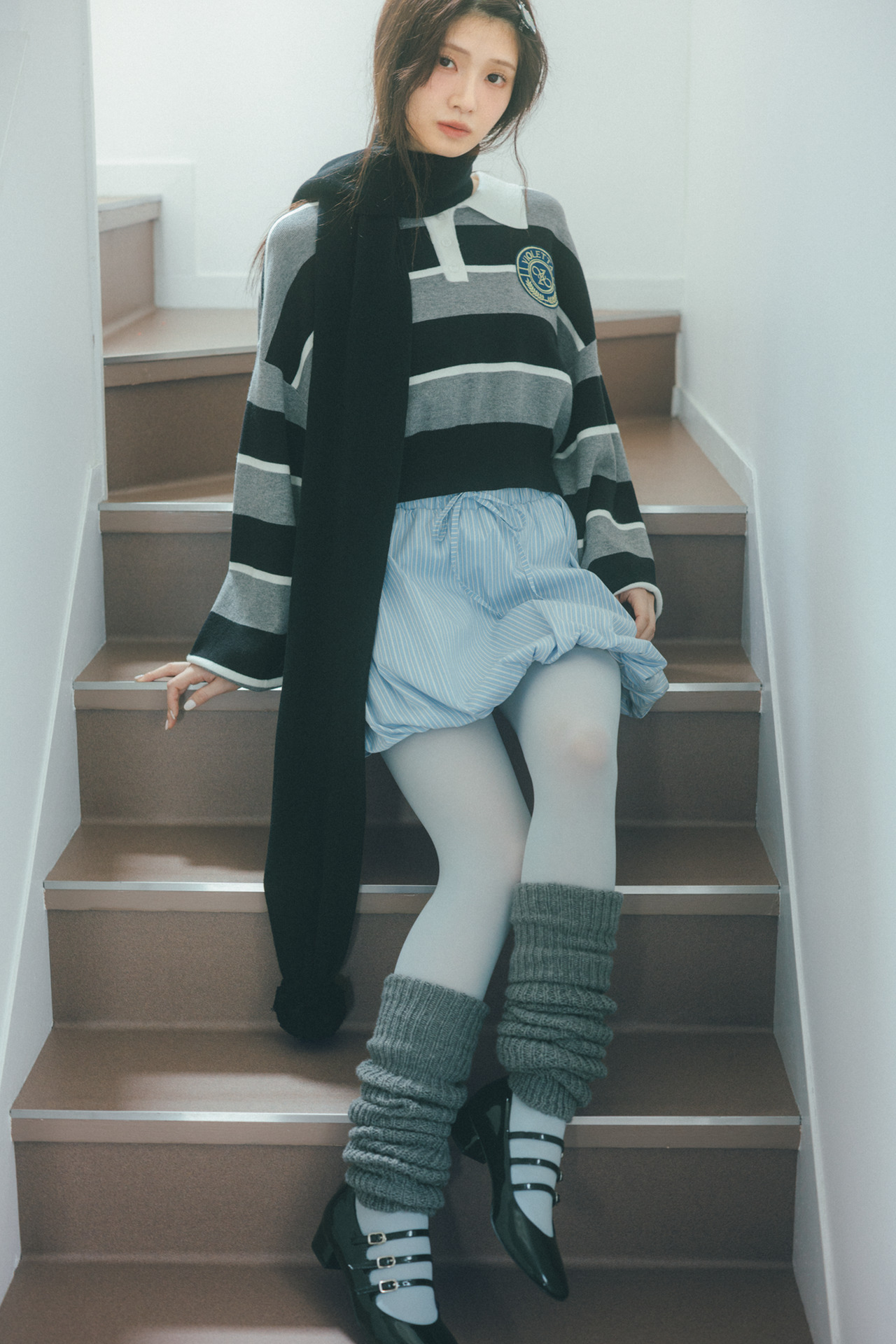 シンプルなグレーもカラータイツに重ねてプレッピースタイルを更新。レッグウォーマー¥1,650/靴下屋(タビオ) タイツ¥2,420/ぽこ・あ・ぽこ シューズ¥12,100/ルタロン(ル タロン 有楽町マルイ店) シャツ¥6,820/ヴィオレッタ(アンティローザ) スカート¥17,600/ガールズソサエティ マフラー¥15,