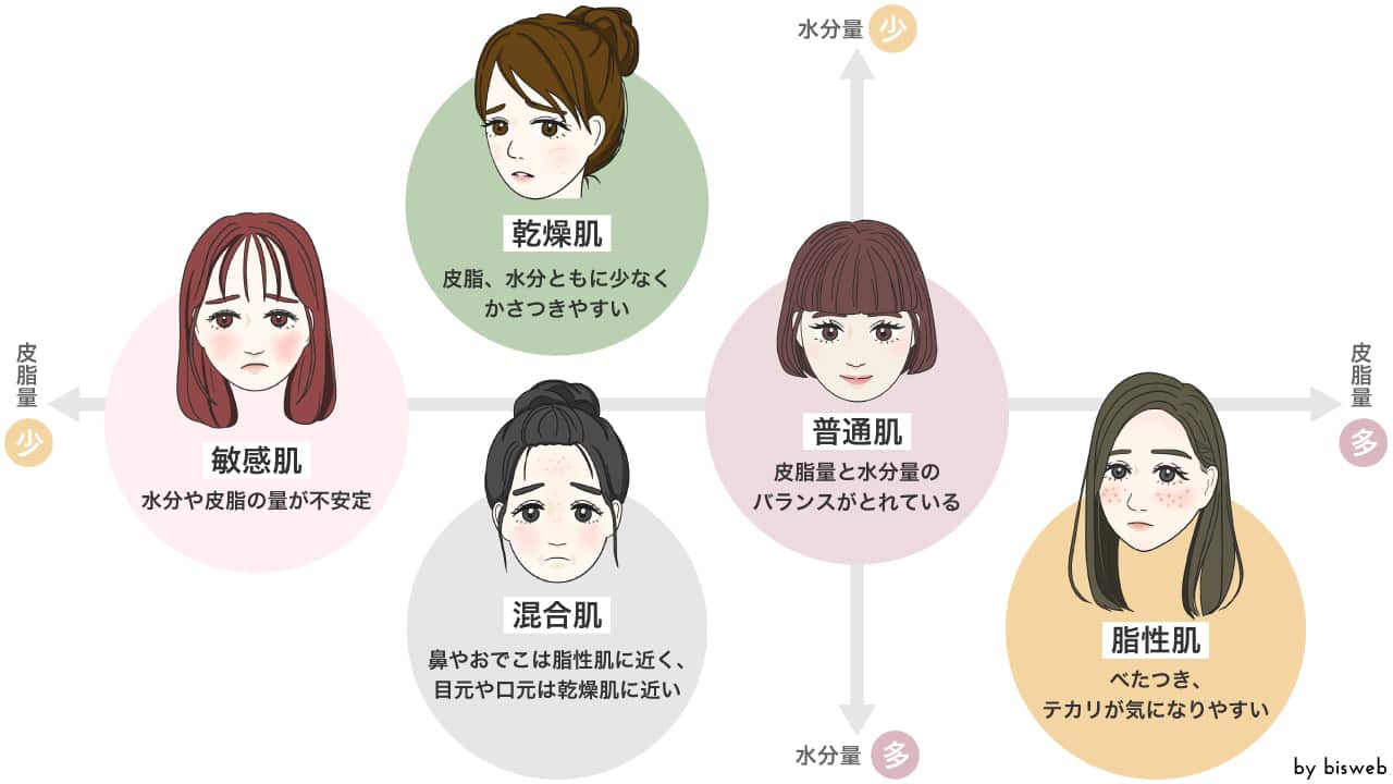 肌質は大きく、乾燥肌、脂性肌、混合肌、敏感肌の4タイプに分けられます。自分がどのタイプかを知ってケア方法を変えると、より美肌に近づけます♡