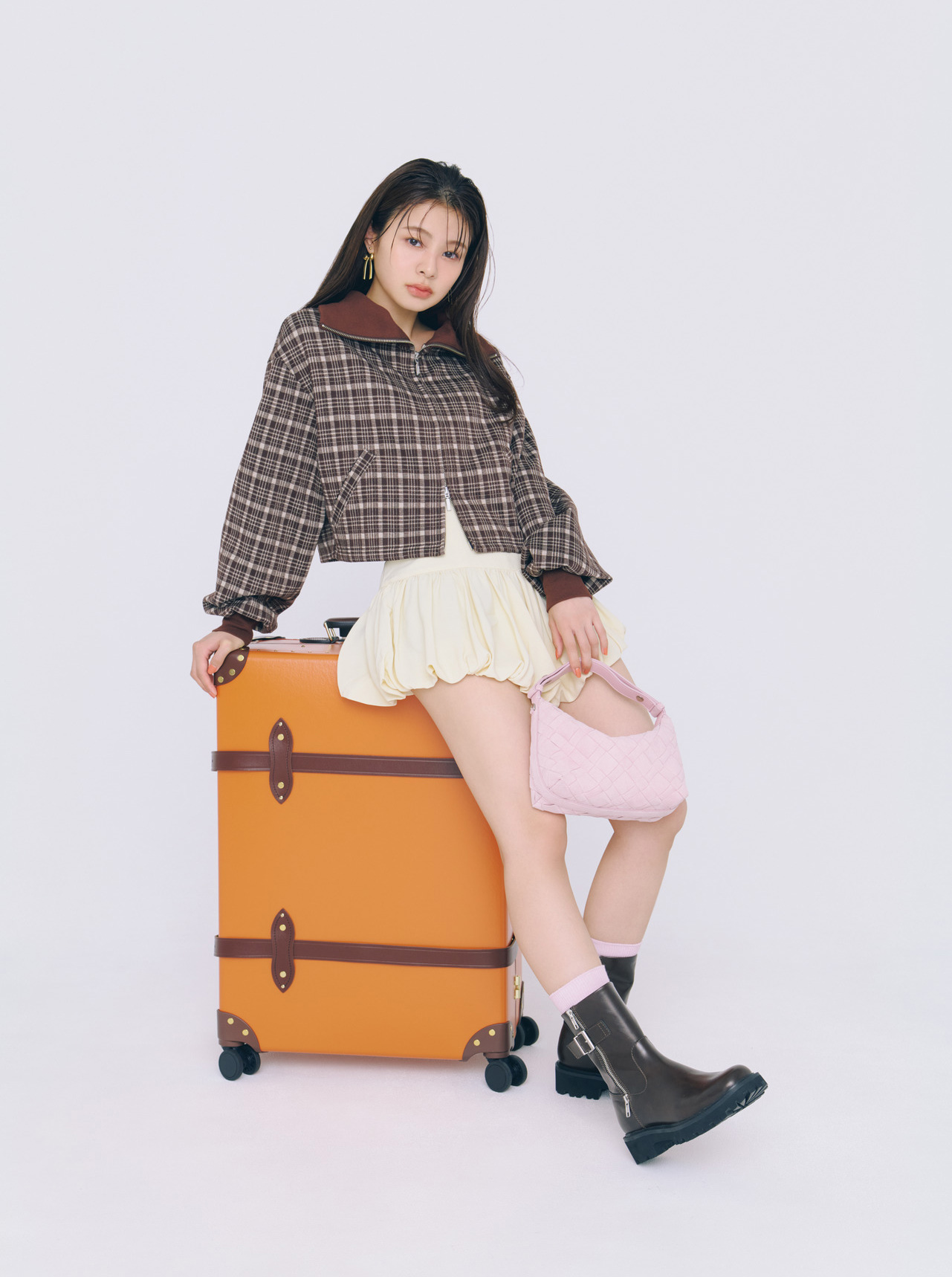 ブルゾン¥9,790 /カルナムール スカート¥42,900 /アキコアオキ(SHEEP 原宿) ピアス¥105,600 /グーニャ プロジェクト(H3Oファッションビュロー) バッグ¥15,900、ブーツ¥12,900 /ともにチャールズ&キース(チャールズ&キース ジャパン)スーツケース¥451,000 /グローブ・トロッター(グローブ・トロッター 銀座) ソックス/スタイリスト私物