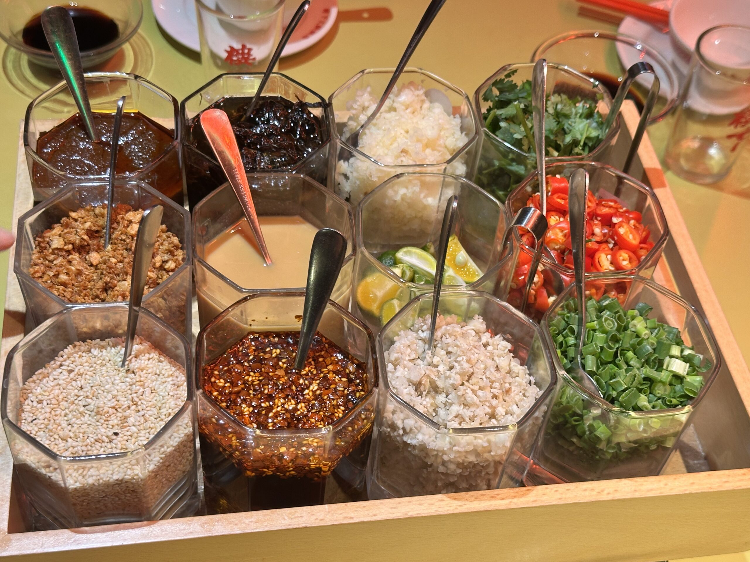 このお店の魅力は、豊富な種類のスープと薬味を自分好みにカスタマイズできること。