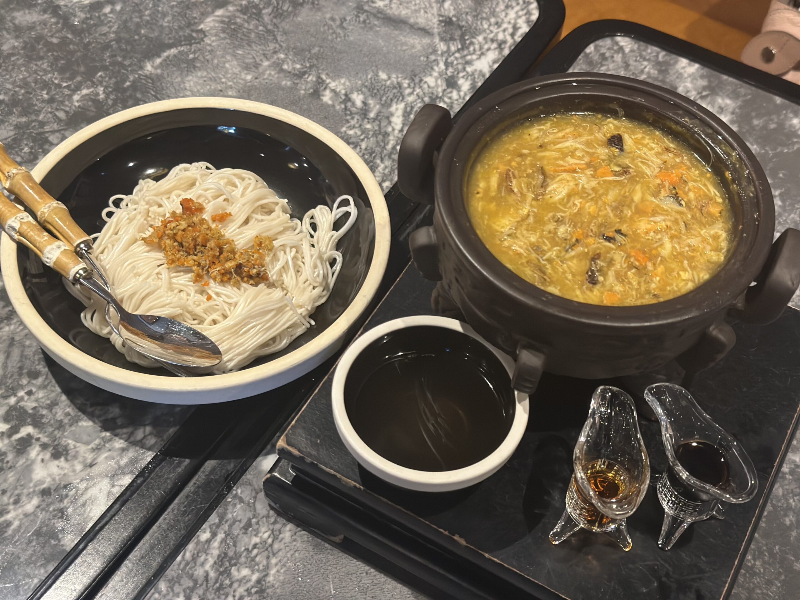 ほかにも香港名物の鳩のローストや黄金蟹味噌の餡掛け麺、土鍋ティラミス、やさしい甘さの杏仁スープや小豆スイーツまで。