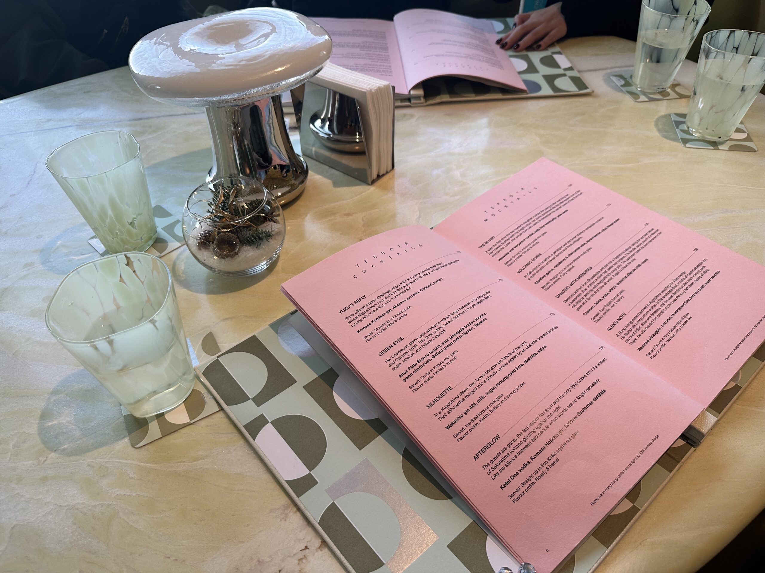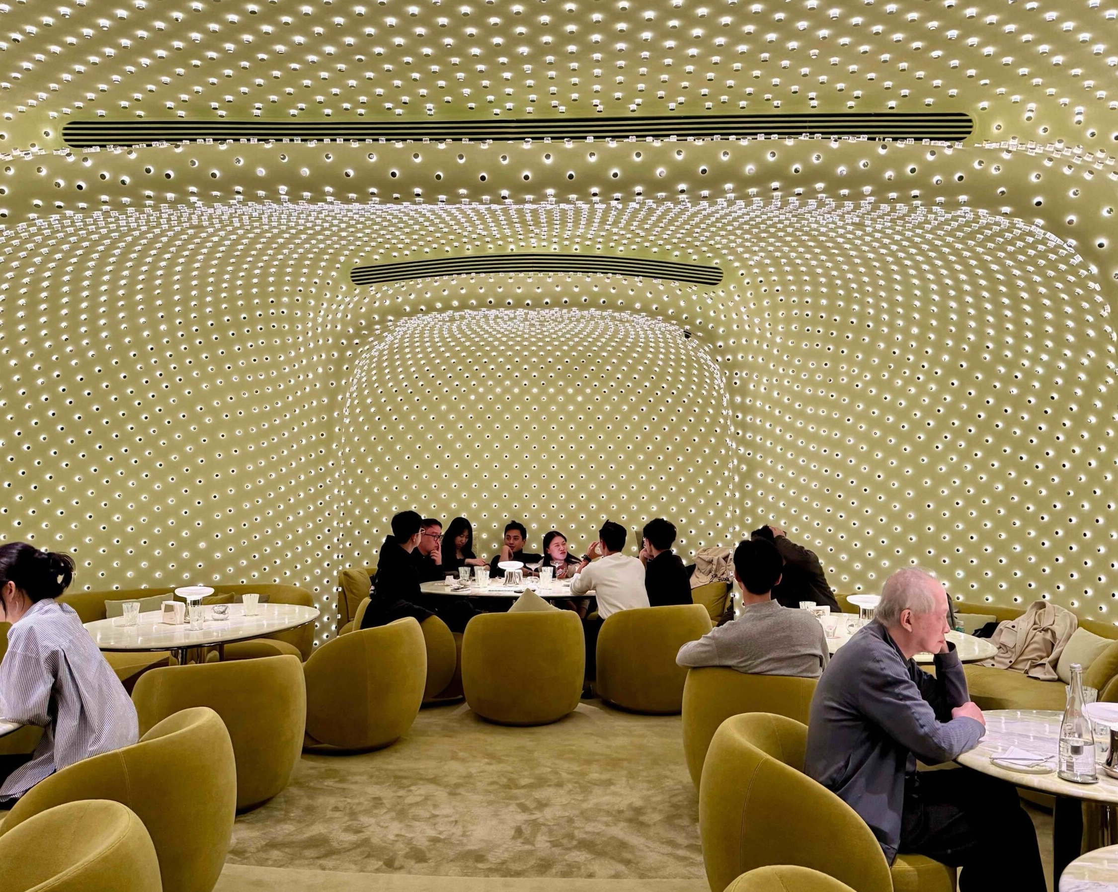 艶やかな大理石のバーカウンターやガラスのアクセント、ふんわりとしたモヘア素材のシートが光を受けて、きらびやかなのにどこか上品で、どこを切り取っても写真映え!